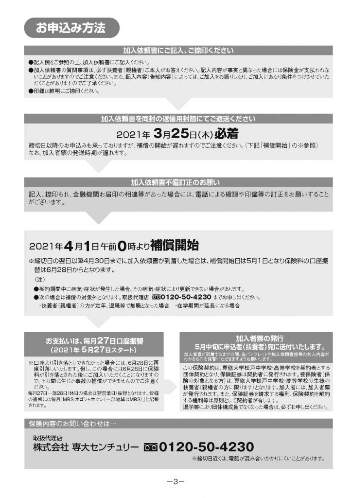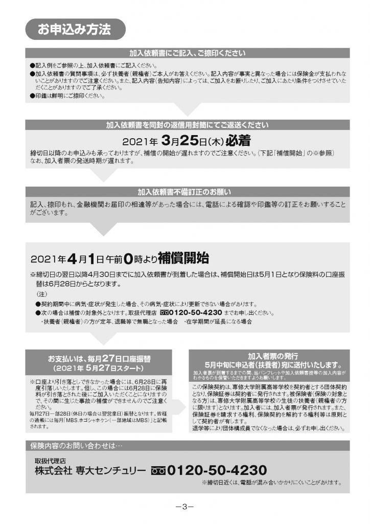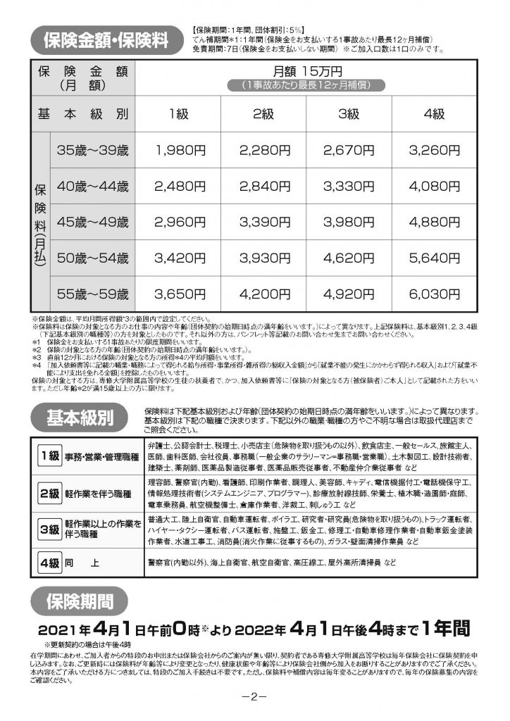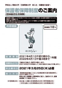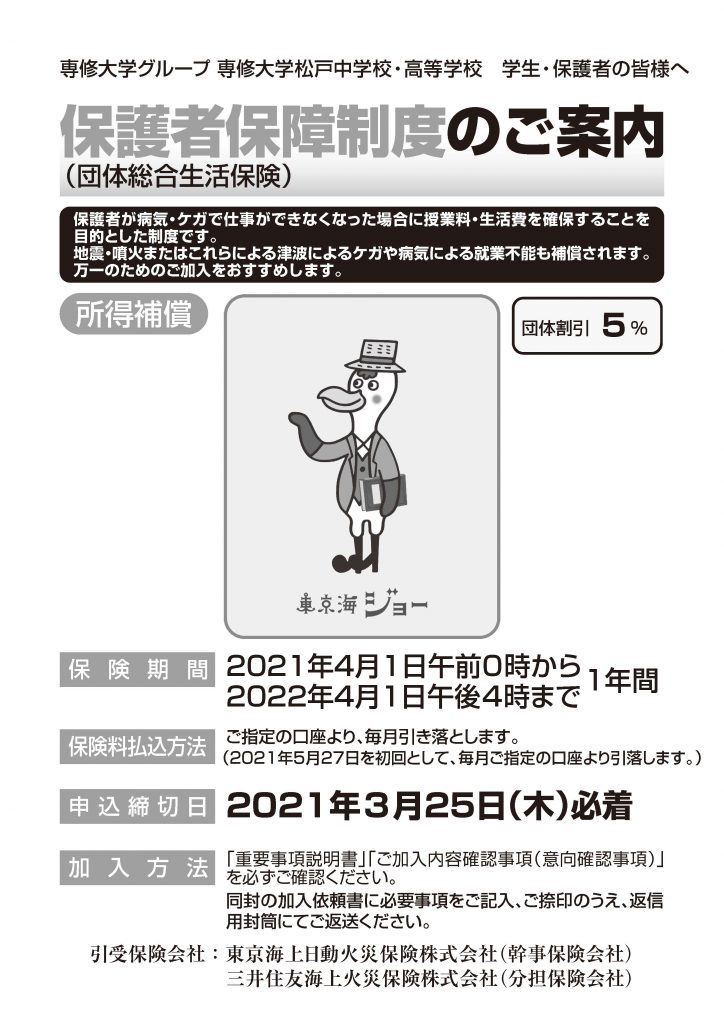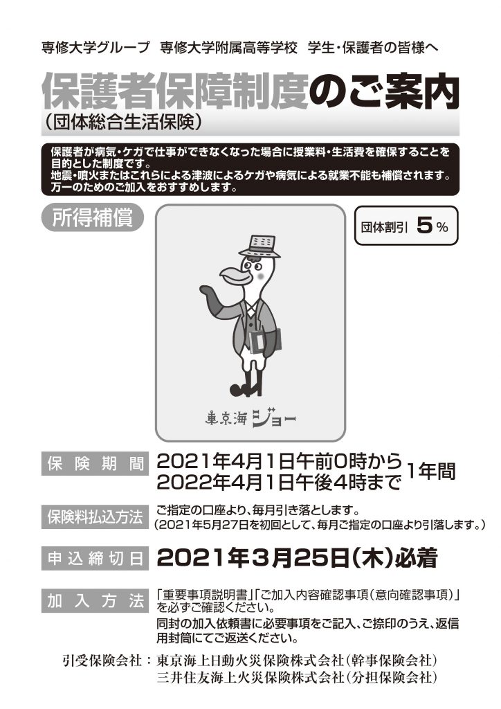 保護者保障制度パンフレット 扶養者が病気やケガによって就業不能となり収入が減少した際の授業料や生活費を確保するための制度です。 2021年度 専修大学・石巻専修大学 パンフレットを見る→ お問い合わせ 専修大学附属高等学校 パンフレットを見る→ お問い合わせ 専修大学松戸中学校・高等学校 パンフレットを見る→ お問い合わせ